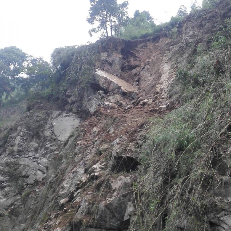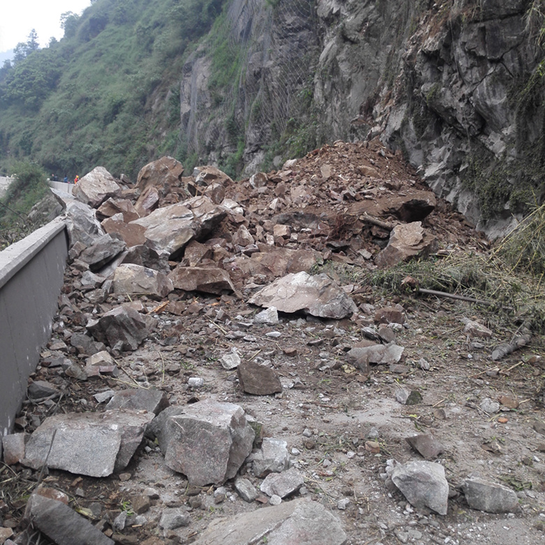 5月10日14點,國道318線天全縣境內月亮灣大橋往二郎山方向約60m處公路內側邊坡發生小規模崩塌,緊急搶修后交通恢復,但坡體上部仍殘留下較多的崩塌物,有隨時下滑掩埋路面再次阻斷交通的可能,途經車輛極其危險,安全隱患極大。