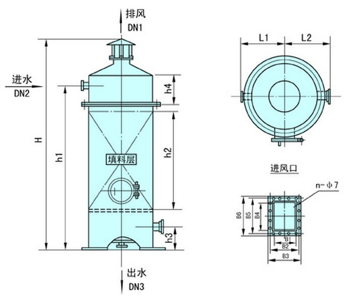 脫氣塔由進水裝置,填料,風機,水箱組成,進水裝置一般采用母支管布水,材質根據不同的需要可以選用304繞絲管和316繞絲管,填料選用多面空心球,根據水質不同可以選用陶瓷和塑料兩種,他主要是起到加大水的表面積,使二氧化碳較好的被吹脫、風機主要是提供風源,從而對水的二氧化碳進行吹脫、儲水箱使處理后的水儲存,可以通過增壓泵打到后續的設備中,除碳器工作時,水從上部進入,經配水裝置淋下,通過填料層后,從下部排入水箱,而風機的提供的風向是逆向的,即從下向上進行吹脫,通過填料層后,由頂部排出。其原理所以當鼓入除碳器的空氣流和除碳水相接觸時,水中CO2便會被空氣流帶出。